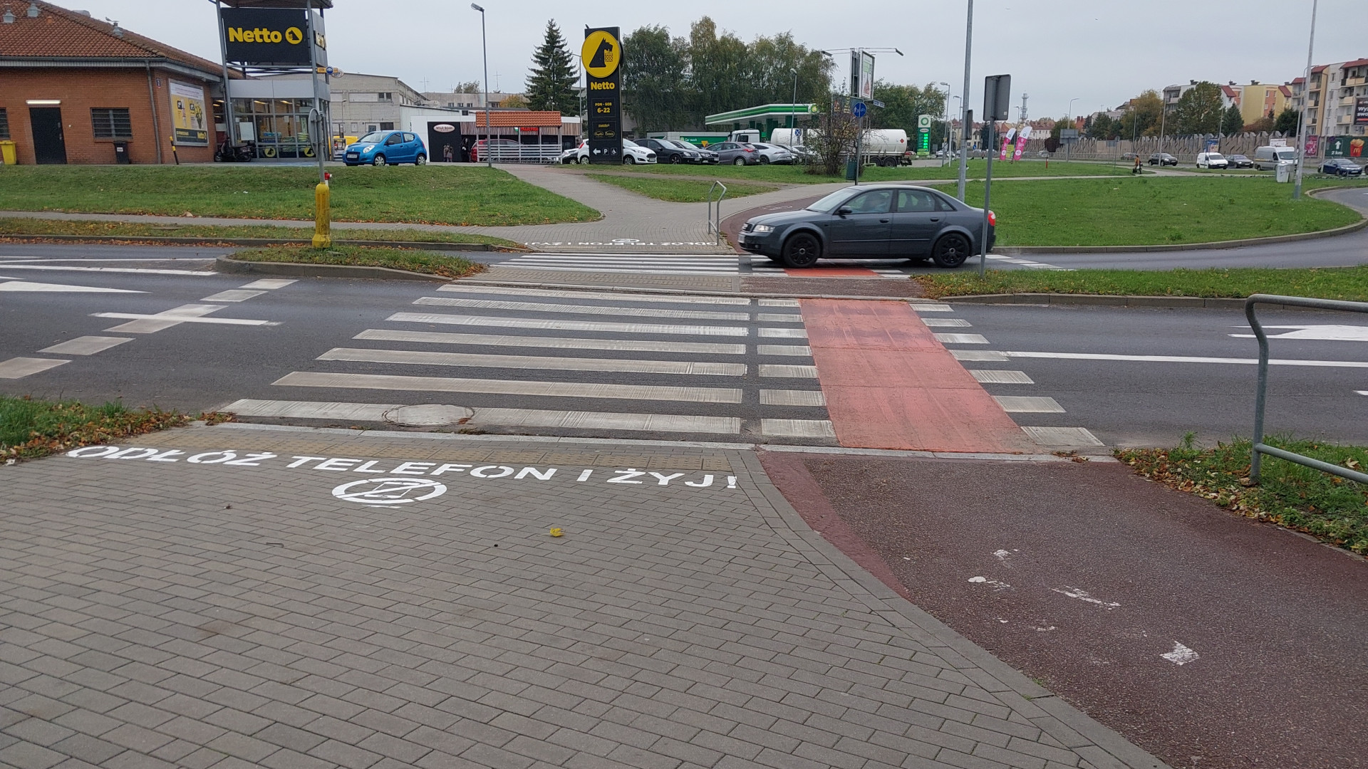 Namalowanie na przyszkolnych , przyprzedszkolnych pasach w Koszalinie "przypominacza" dobrych i bezpiecznych nawyków przy przechodzeniu przez jezdnię w postaci napisów